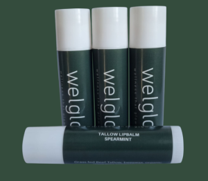 Our third product is a super hydrating Welglo Tallow Spearmint Lipbalm.